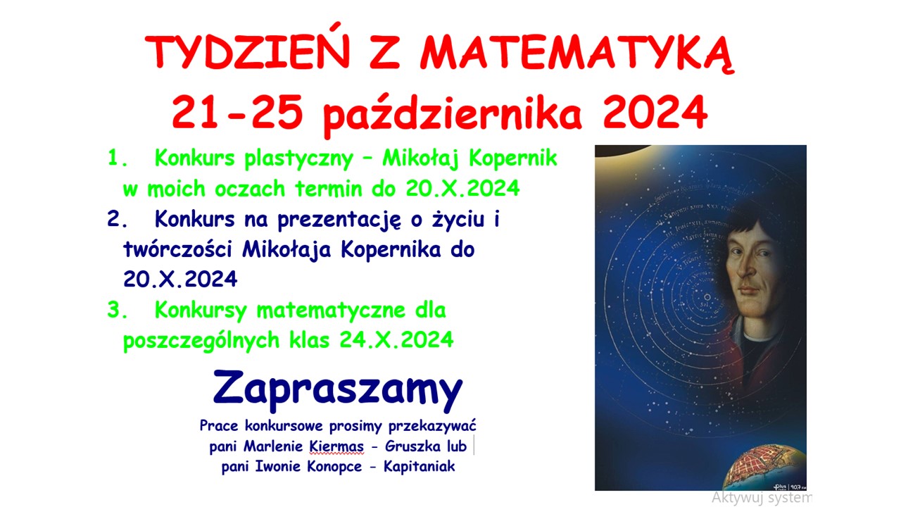 Zapraszamy serdecznie wszystkich uczniów szkoły do udziału w trzeciej edycji  „Tygodnia z matematyką”. W tym roku przybliżamy postać wielkiego polskiego uczonego Mikołaja Kopernika. Życzymy powodzenia wszystkim uczestnikom.